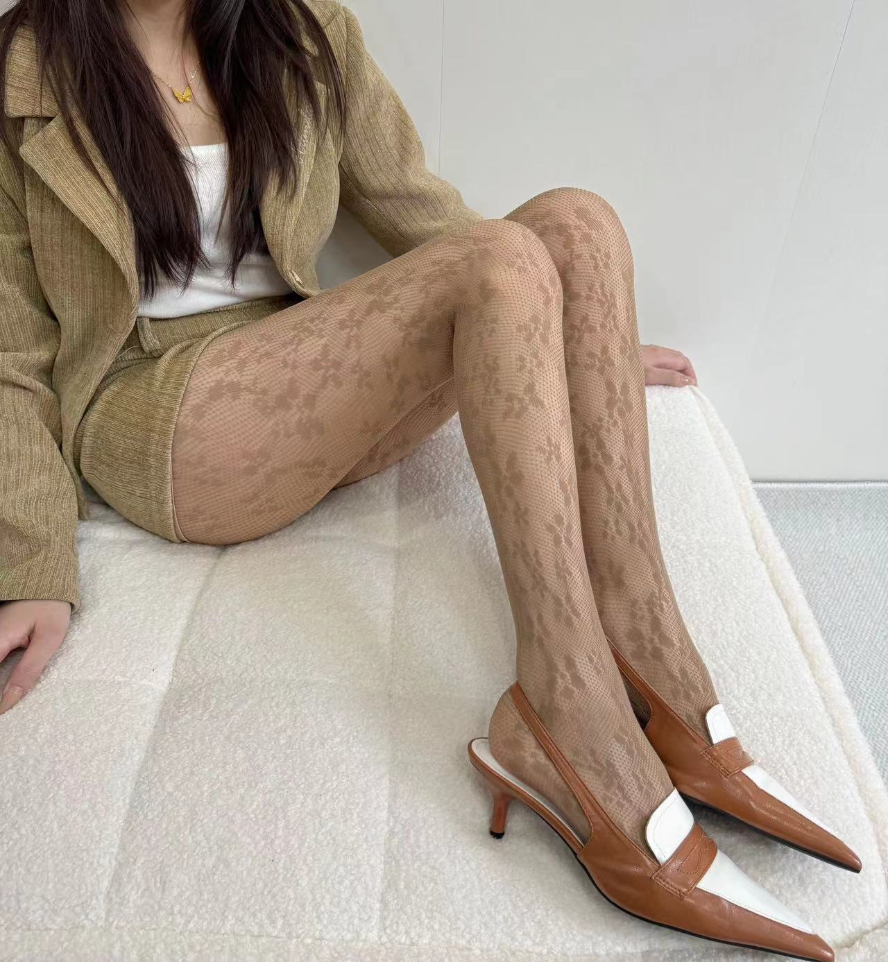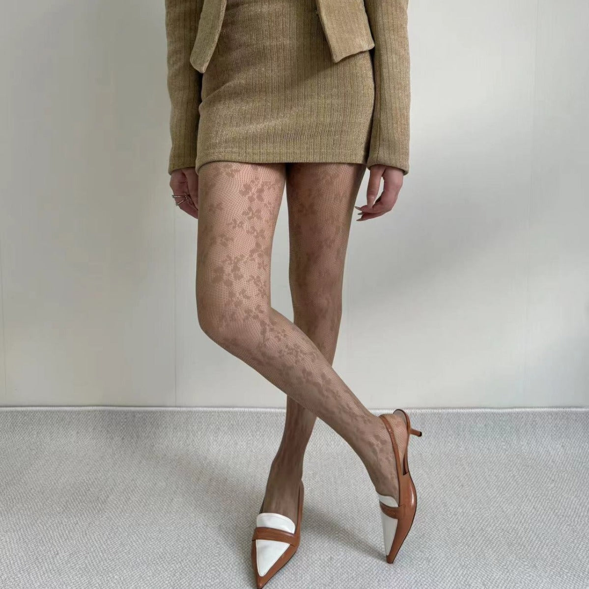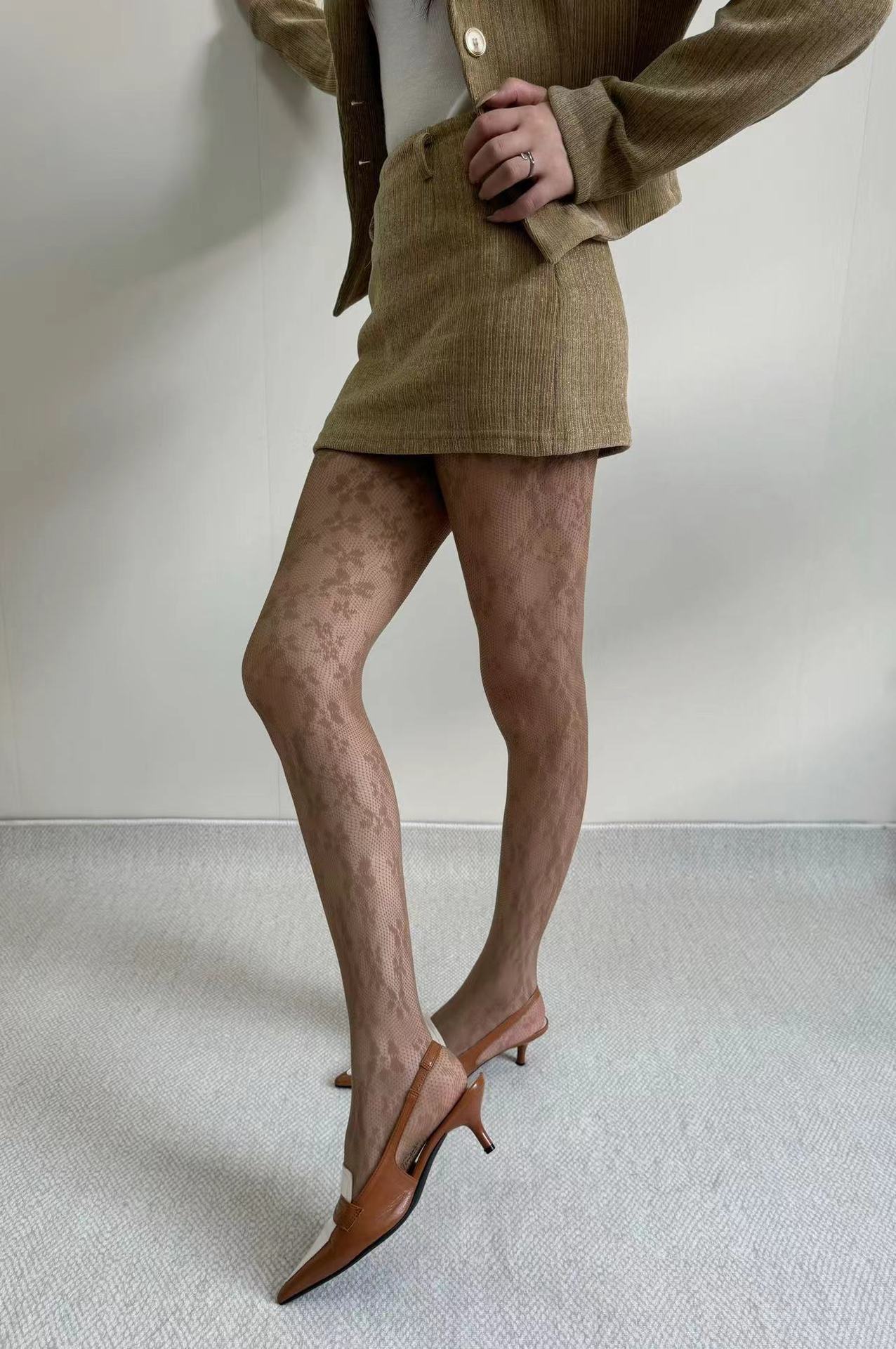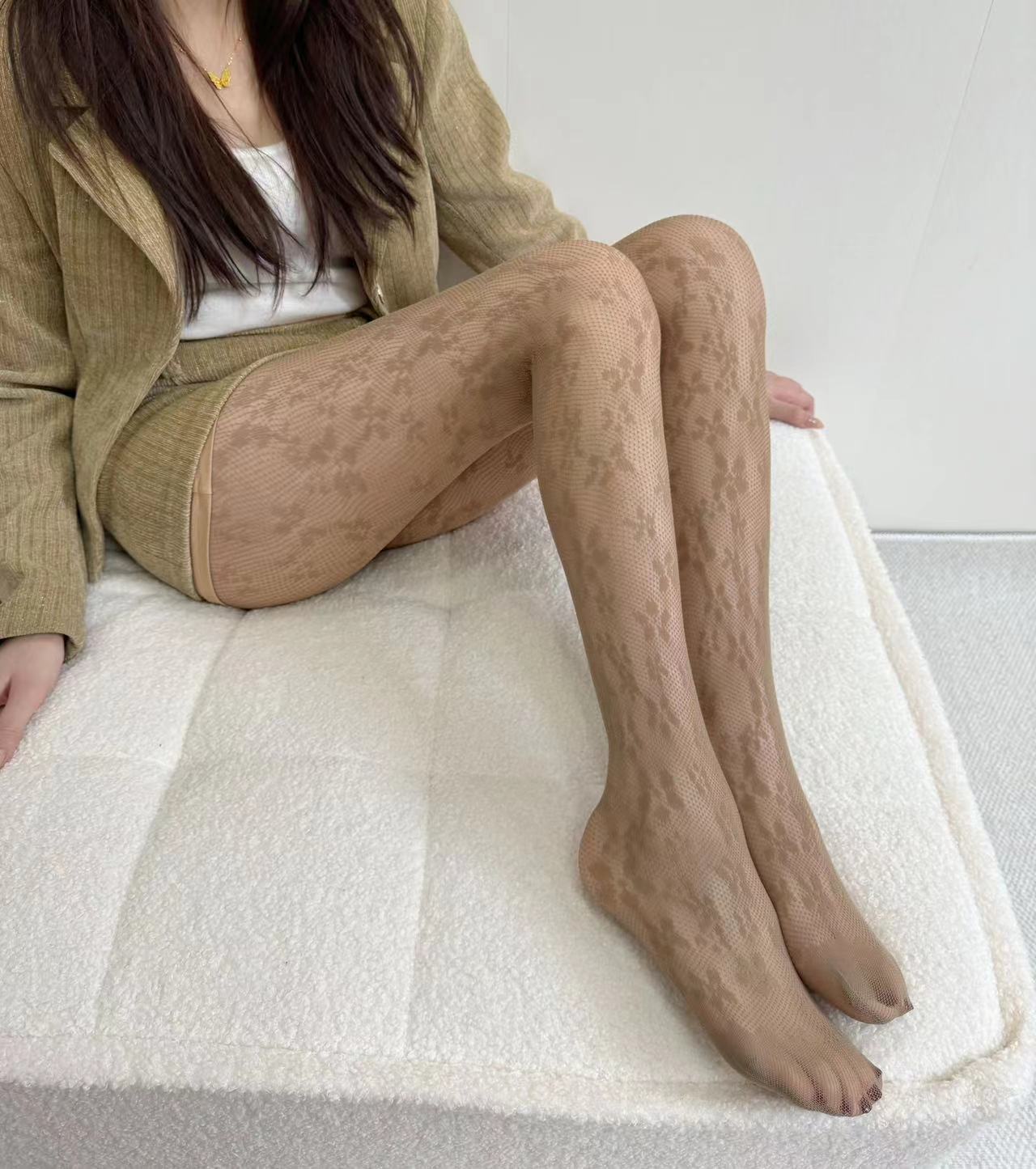 FREEDOMBEAUTY | Autumn and winter fishing net socks Japanese retro small flower jacquard coffee color anti-hook primer pantyhose stockings women