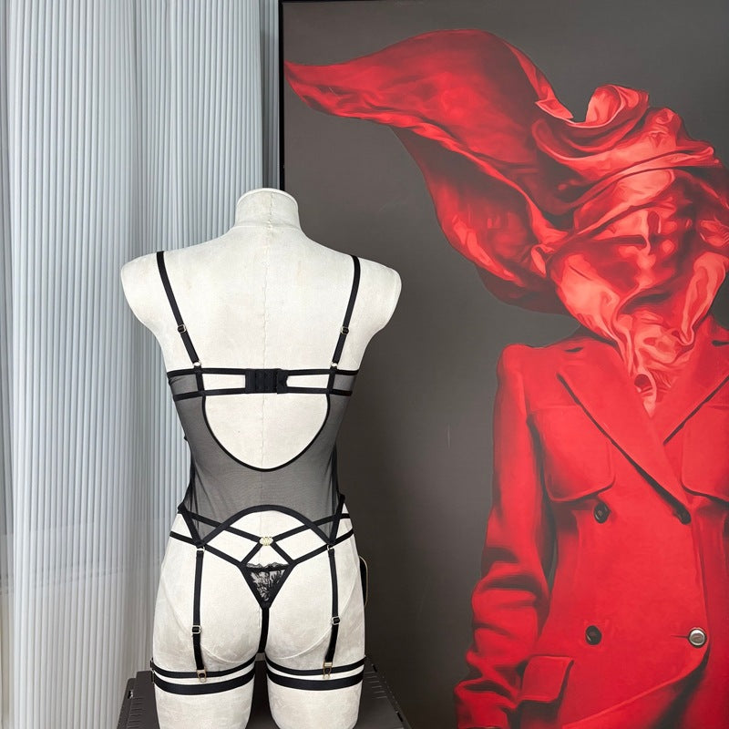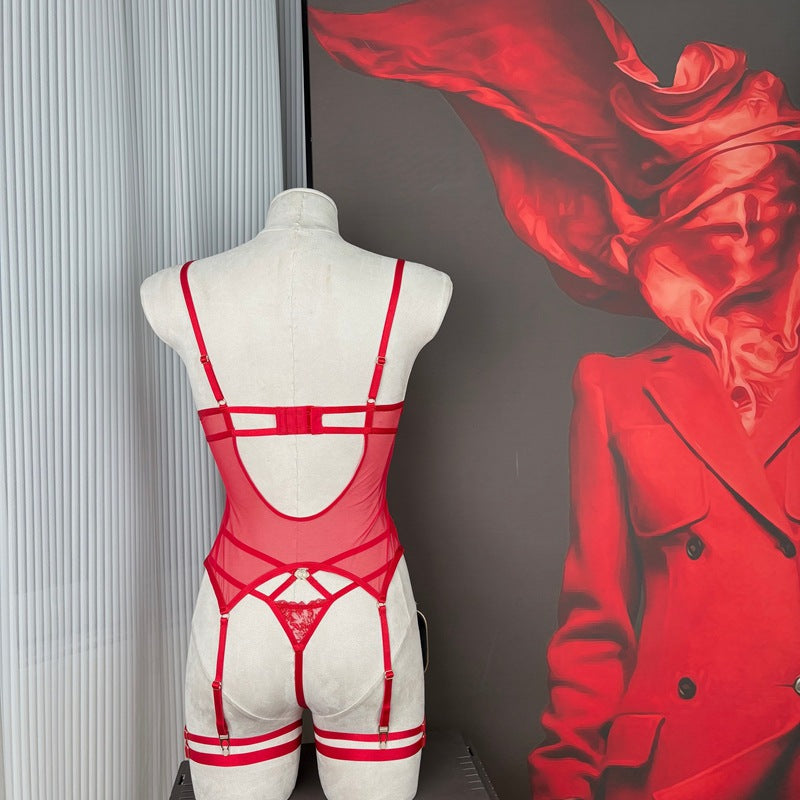 FREEDOMBEAUTY | FQ2873 Embroidery Sponge Tie Corset Garter Mesh Perspective Lingerie Seduction Black Christmas Red
