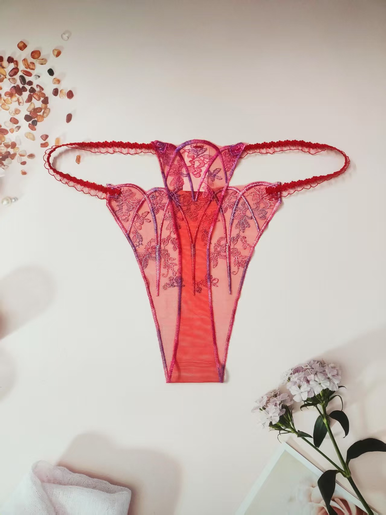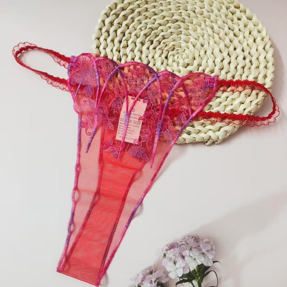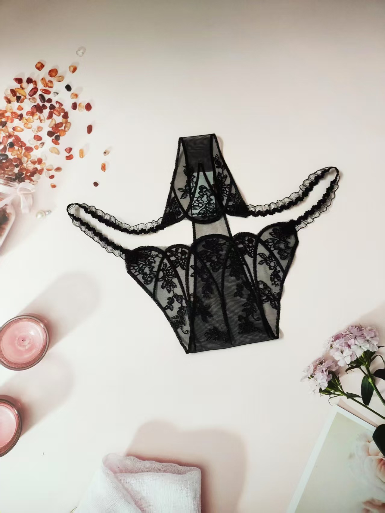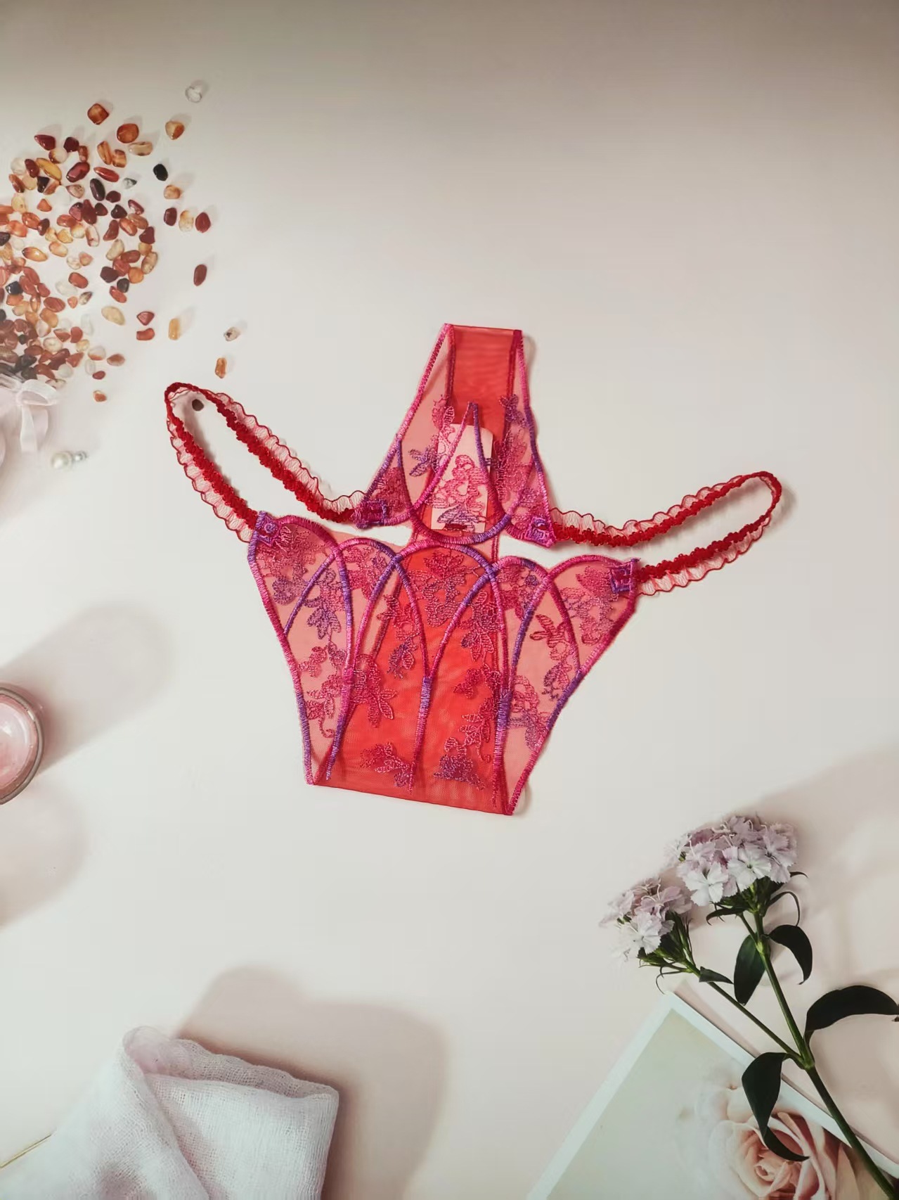 FREEDOMBEAUTY | New women's triangular mesh lace hollow sexy European and American mesh mountains embroidery color matching cross-border perspective T-character