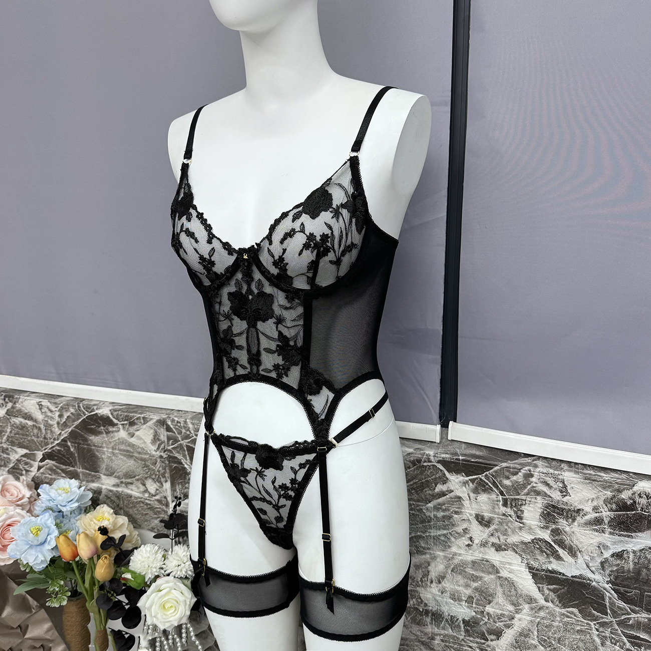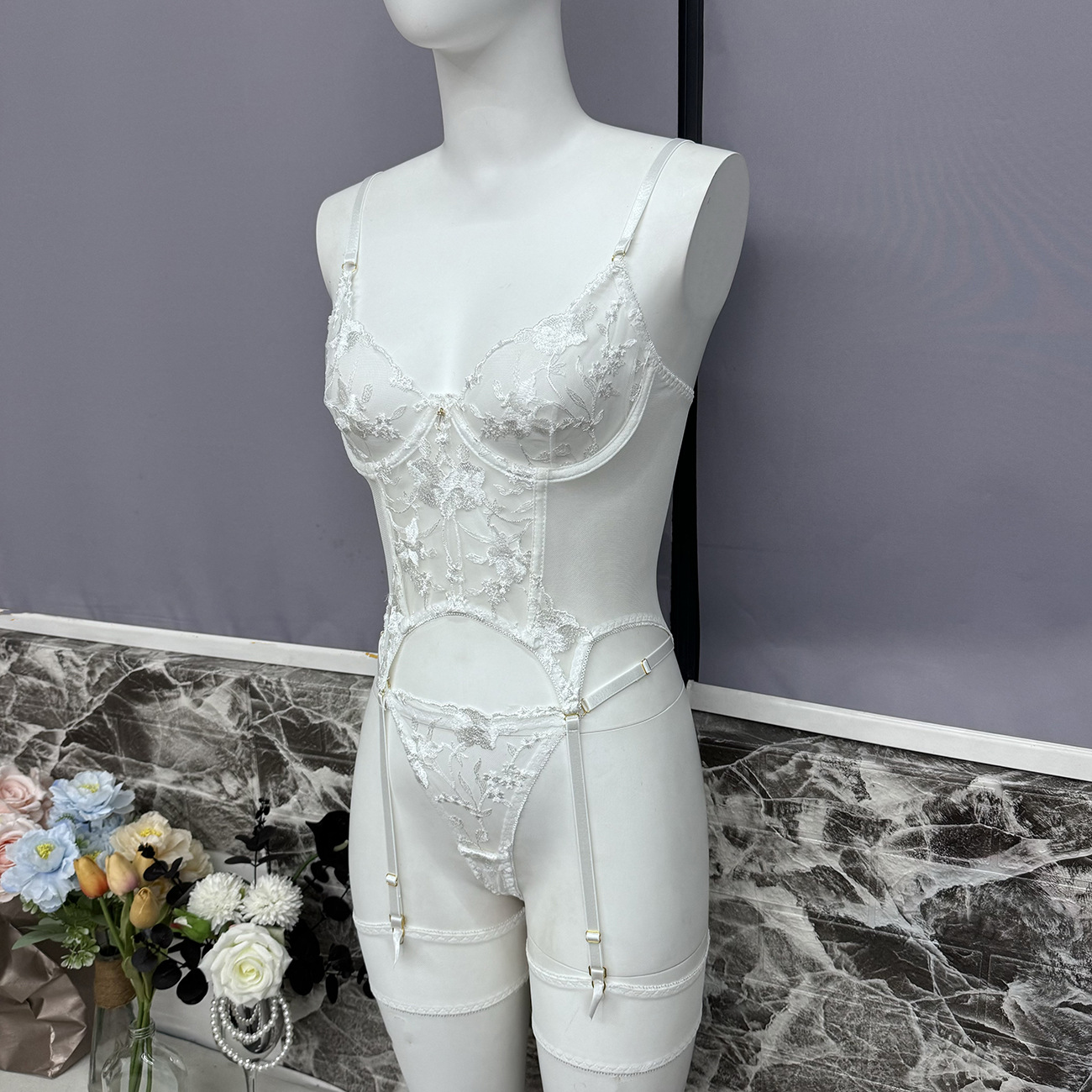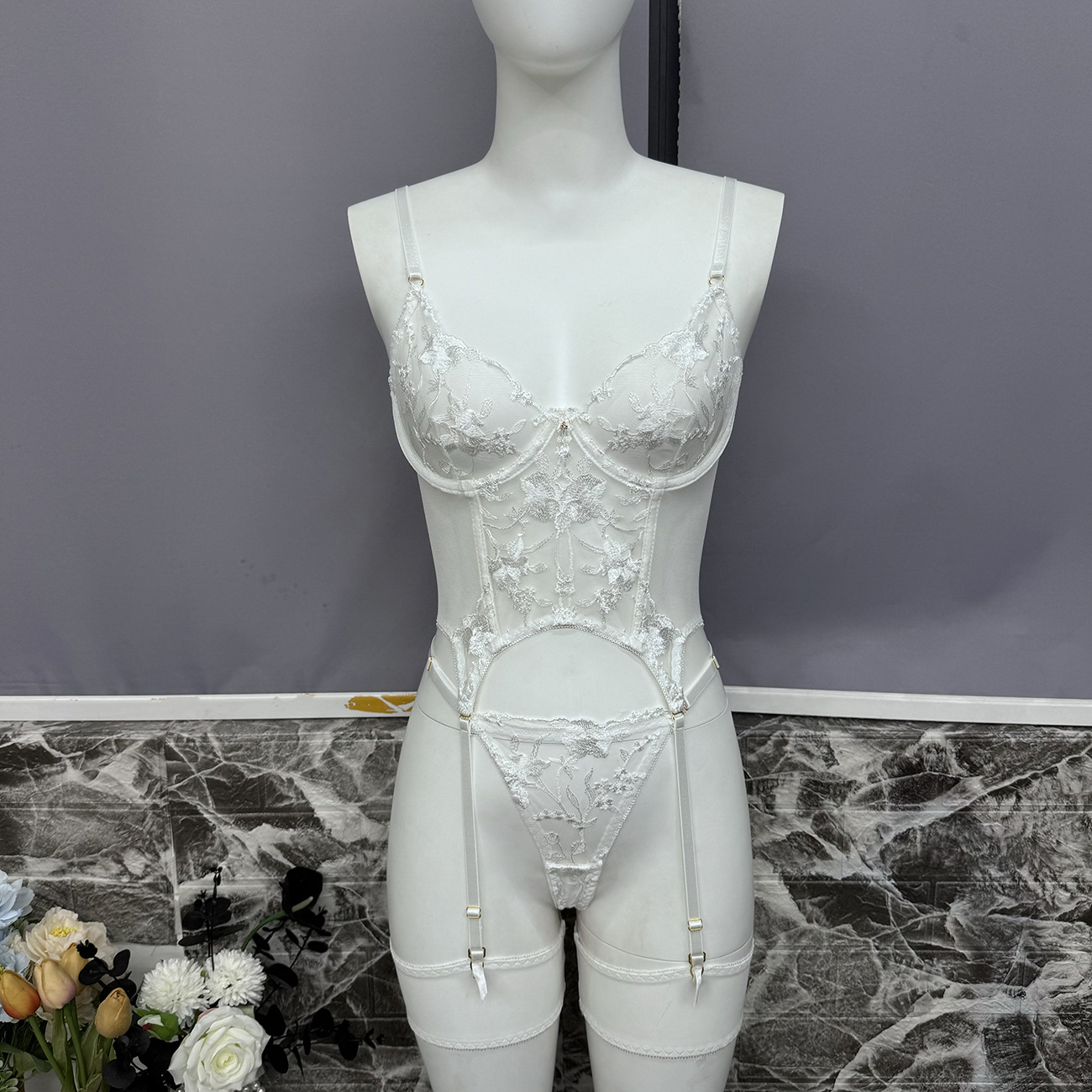 freedombeauty|Popular Sexy Temptation Mesh Heavy Industry Embroidery Mesh 3-piece Bra Set