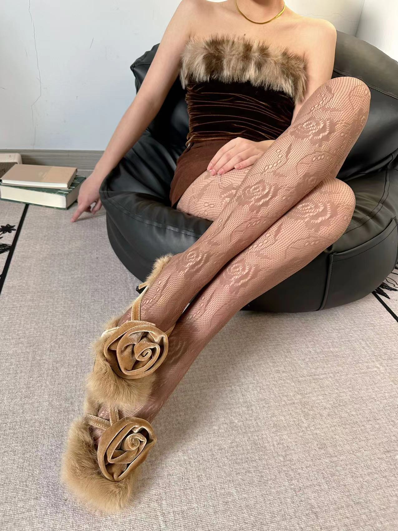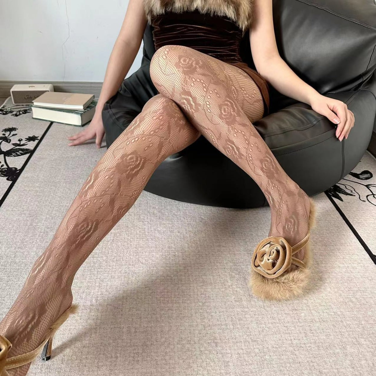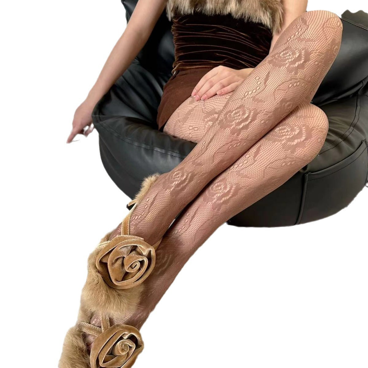 FREEDOMBEAUTY | Spring and summer new retro Chinese style rose hollow jacquard fishing net socks anti-hook bottom pantyhose women