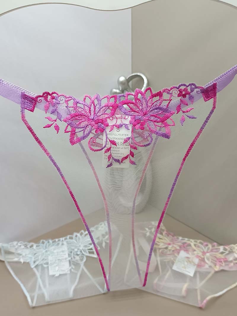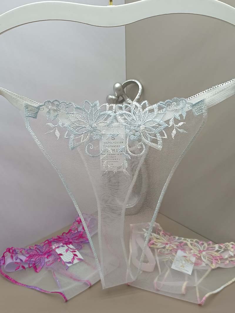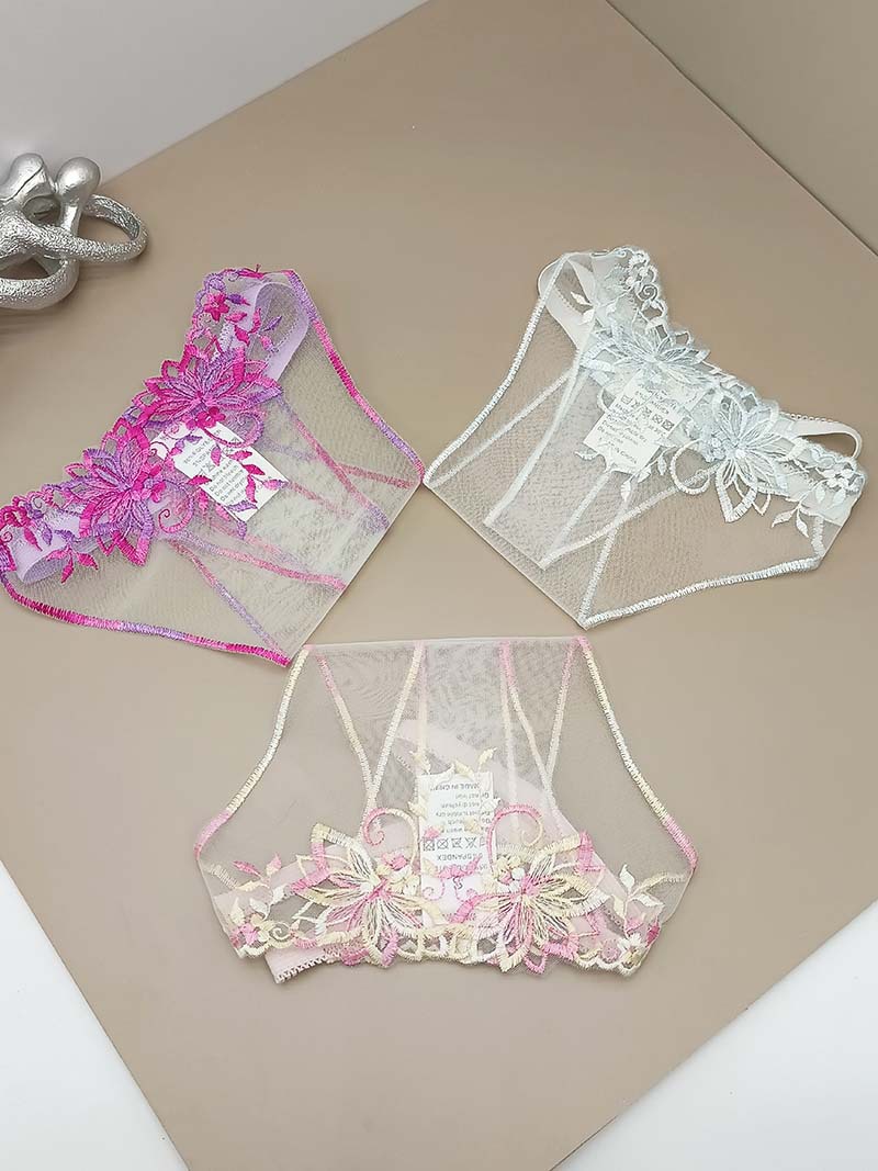 FREEDOMBEAUTY | Transparent mesh embroidery three-piece color matching light crotch-free sexy hollow sex thong three-piece cross-border