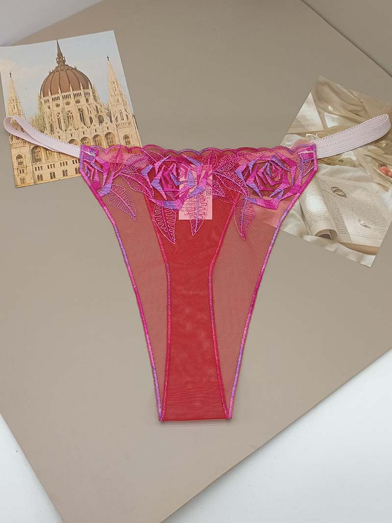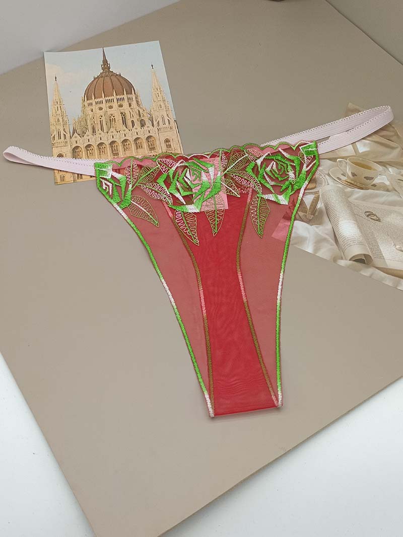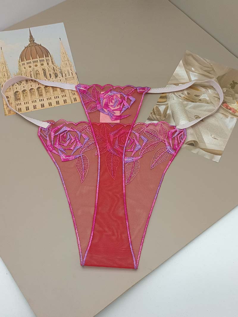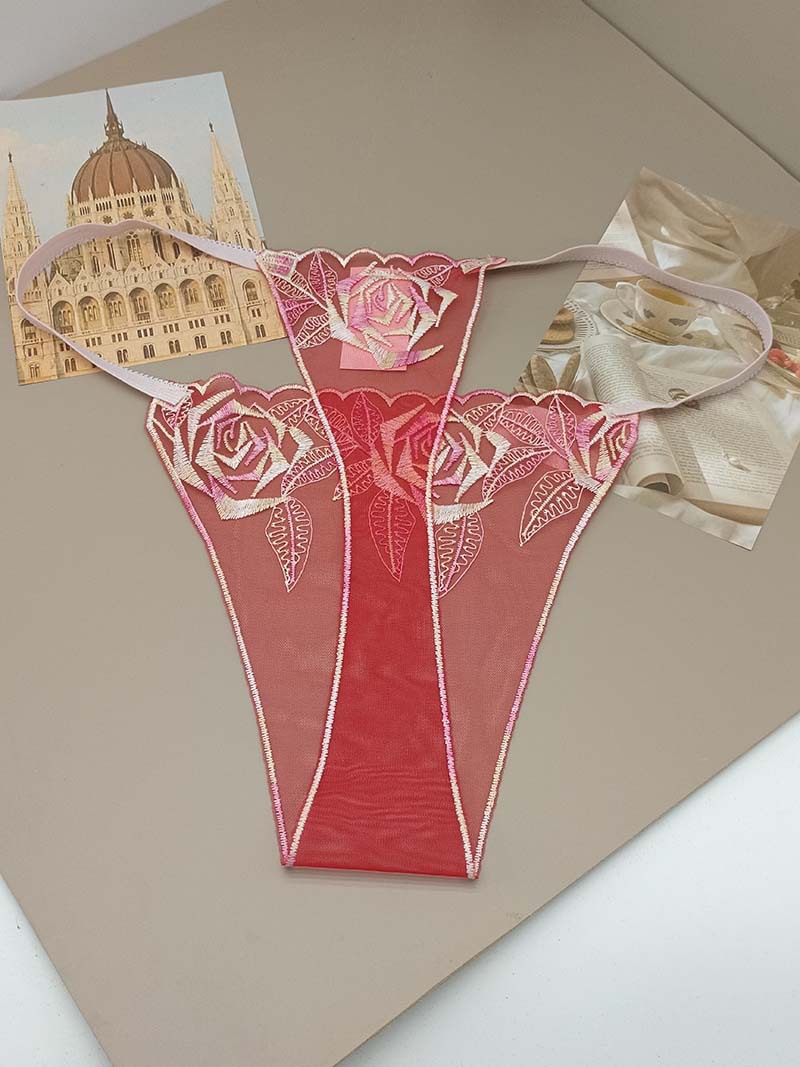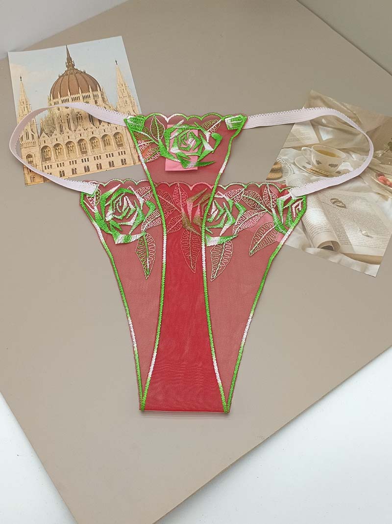 FREEDOMBEAUTY | Transparent red mesh embroidery hollowed-out sexy women's sex thong t-pants flower embroidery perspective panties cross-border