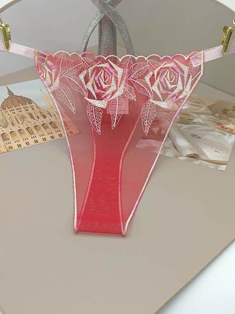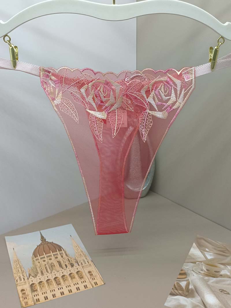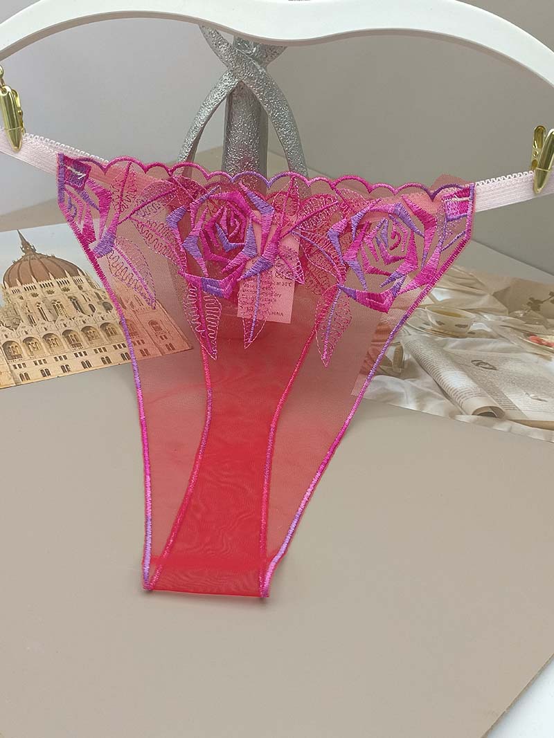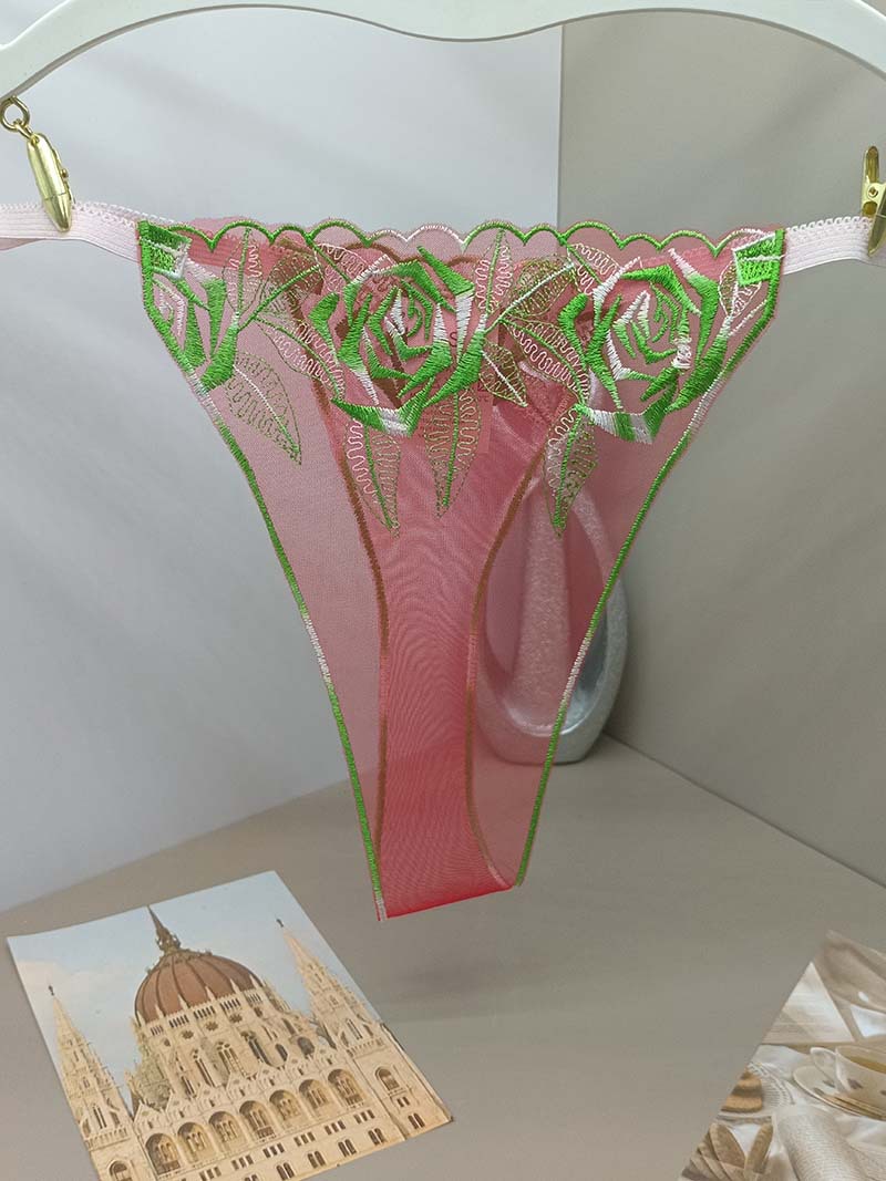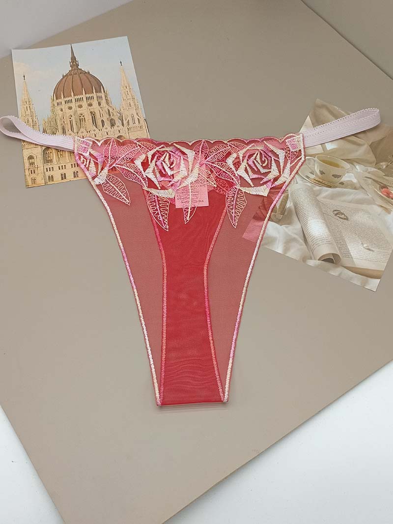 FREEDOMBEAUTY | Transparent red mesh embroidery hollowed-out sexy women's sex thong t-pants flower embroidery perspective panties cross-border