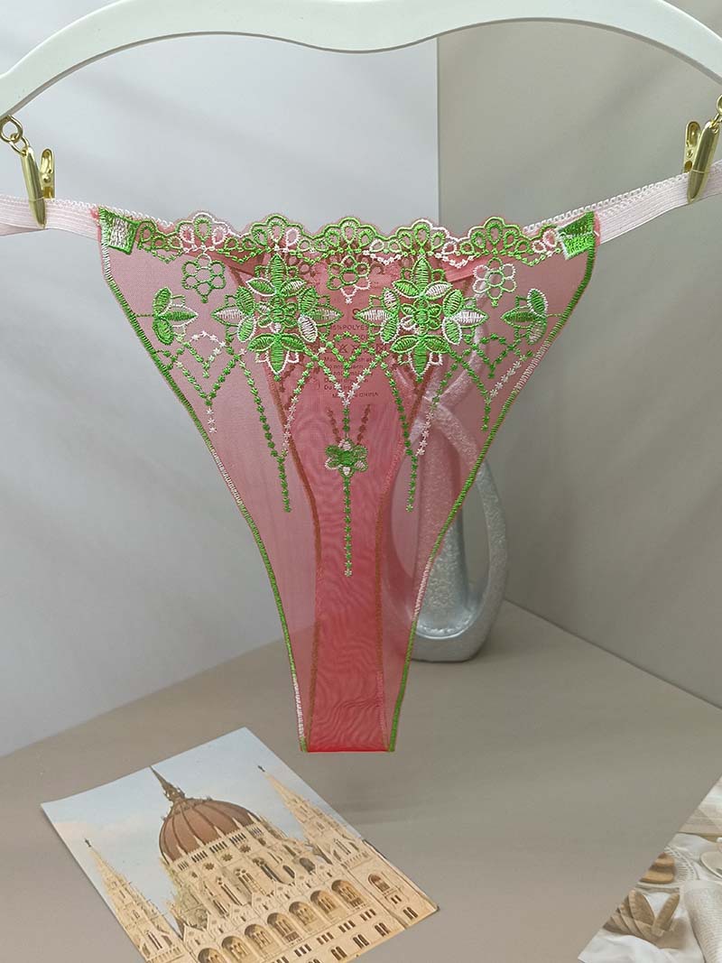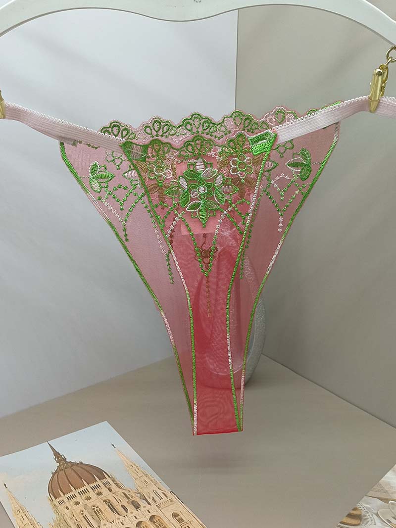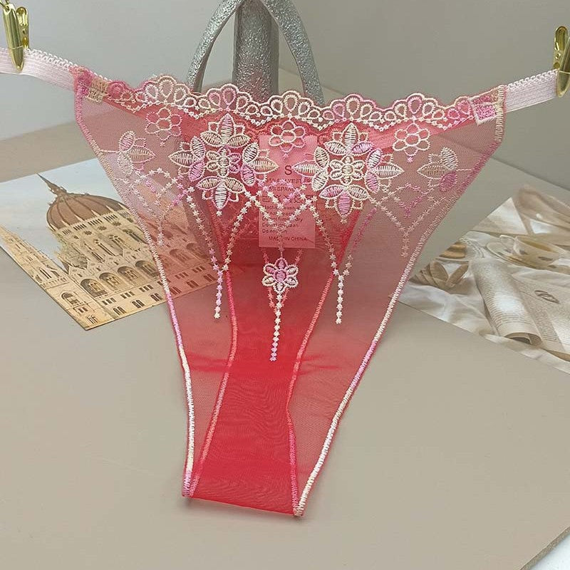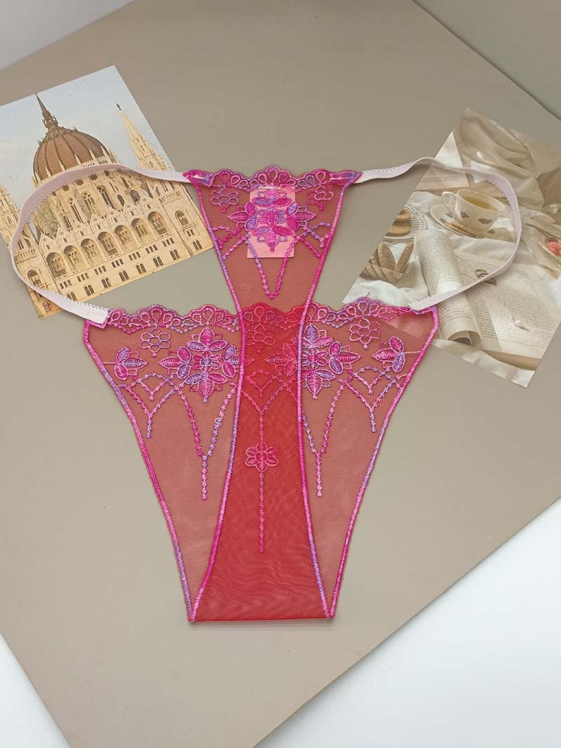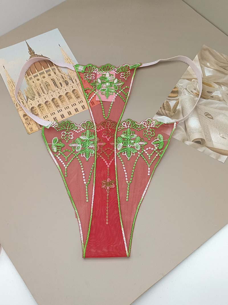 FREEDOMBEAUTY | Triple color green purple pink yellow transparent red mesh pattern embroidery sexy hollow women's sex thong cross-border