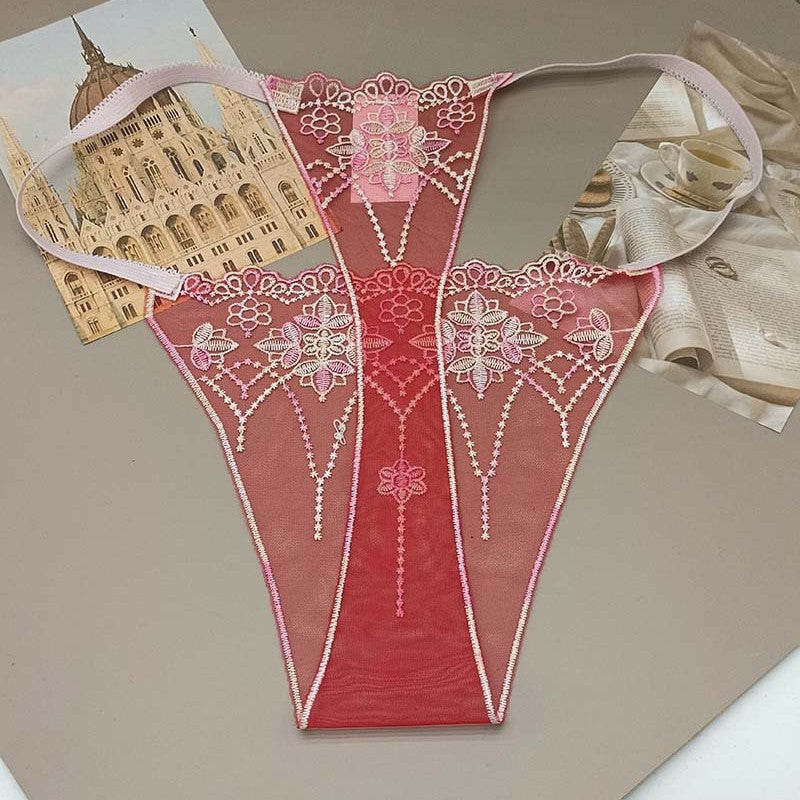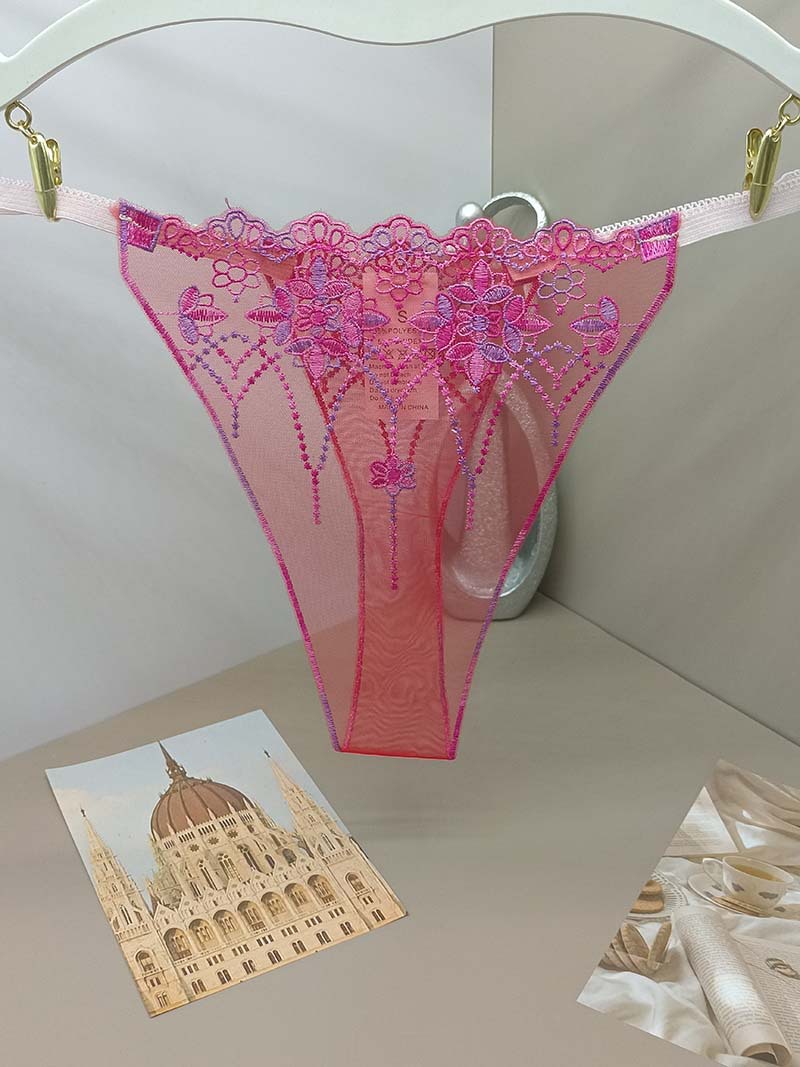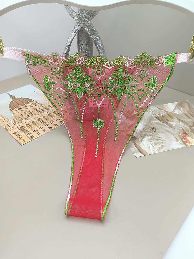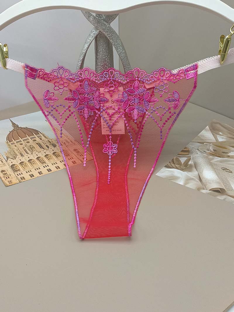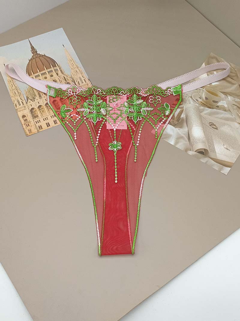 FREEDOMBEAUTY | Triple color green purple pink yellow transparent red mesh pattern embroidery sexy hollow women's sex thong cross-border