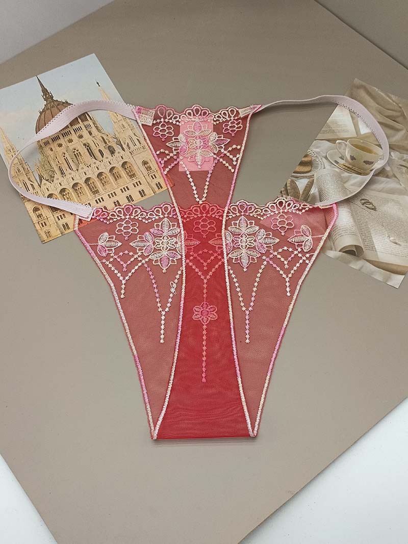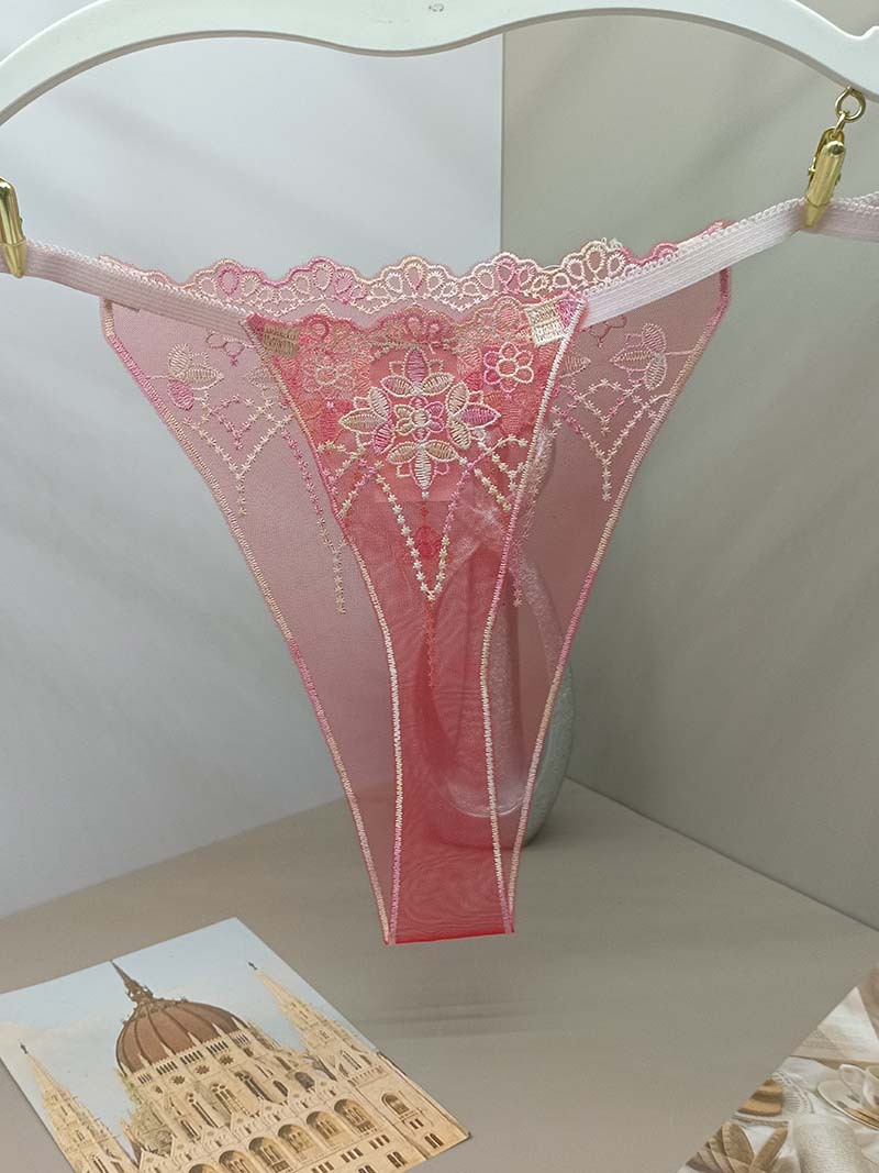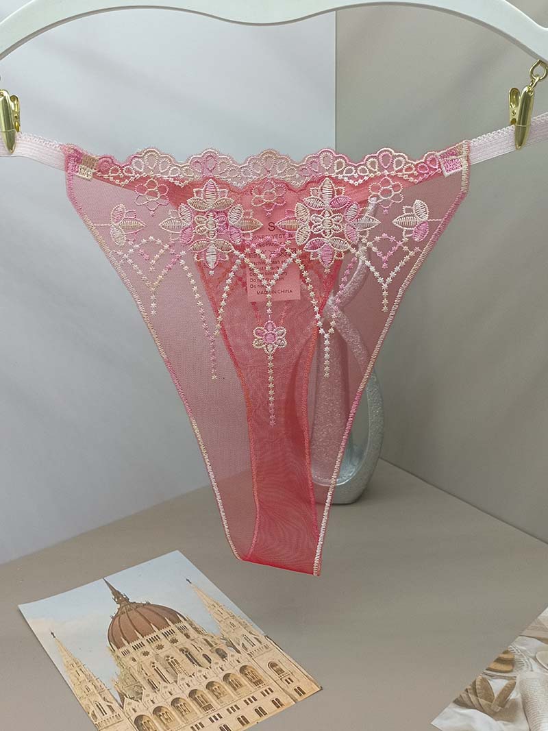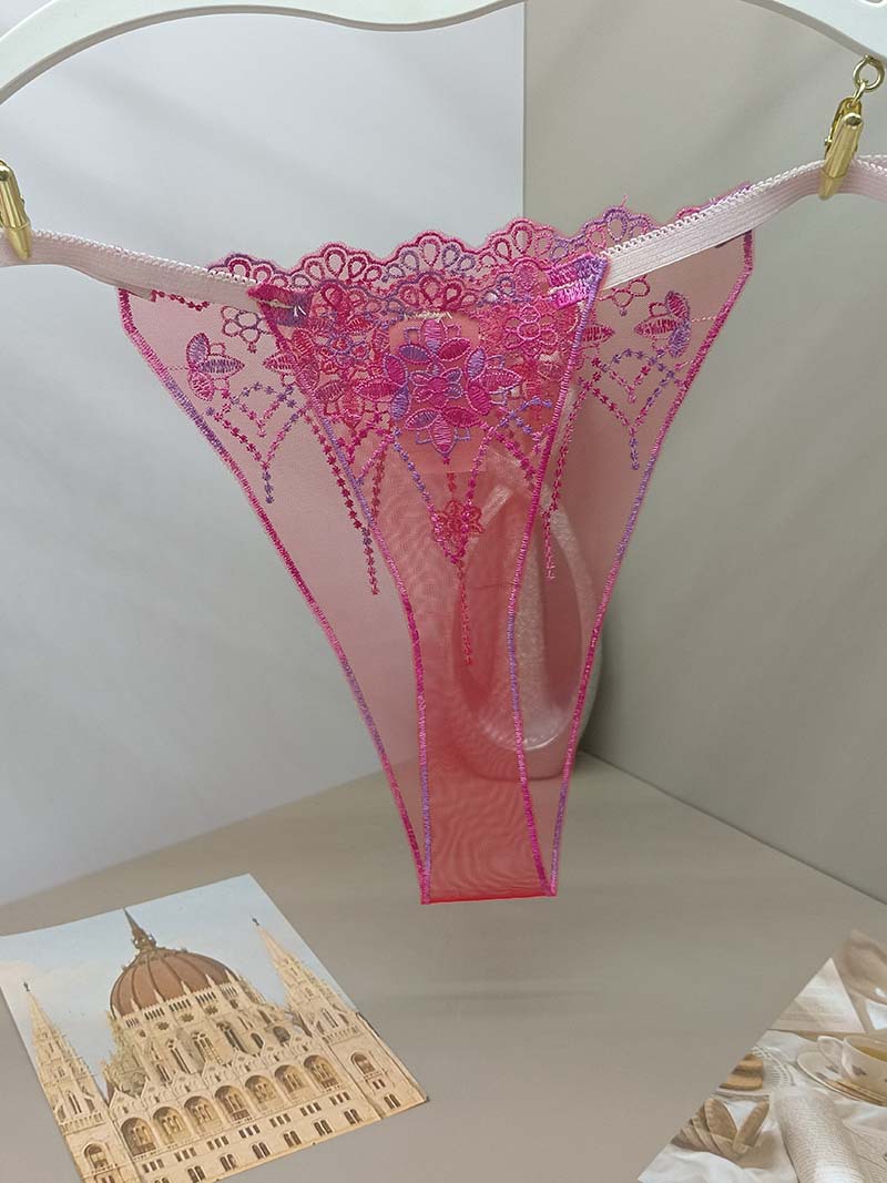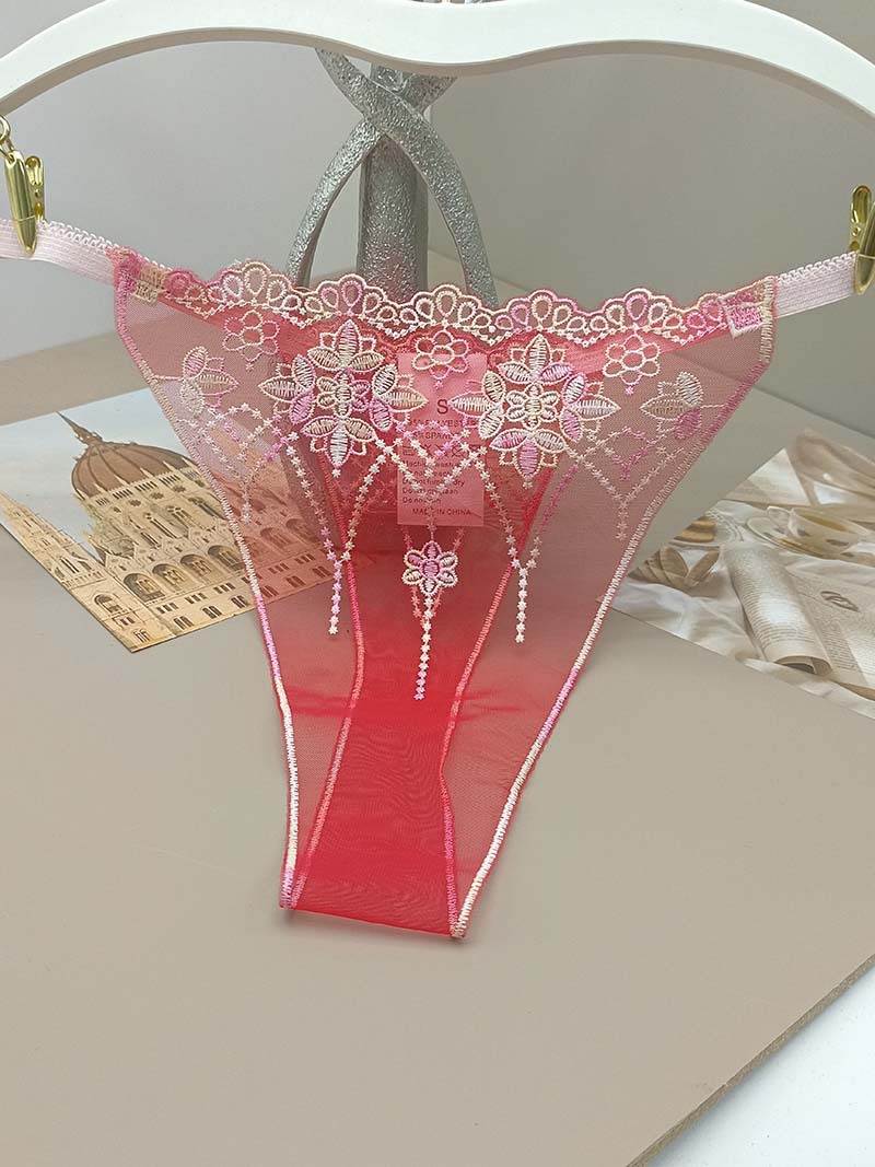 FREEDOMBEAUTY | Triple color green purple pink yellow transparent red mesh pattern embroidery sexy hollow women's sex thong cross-border