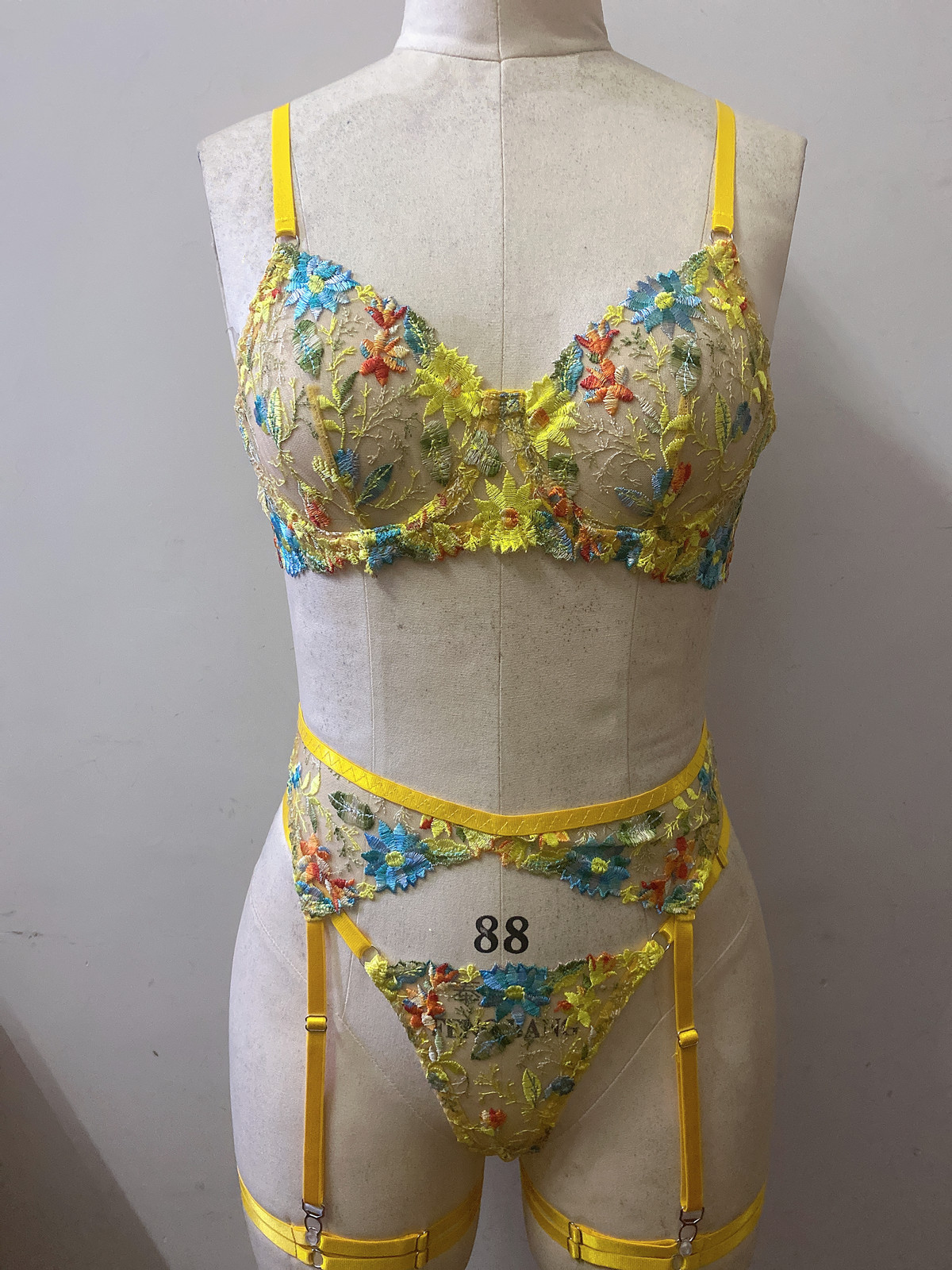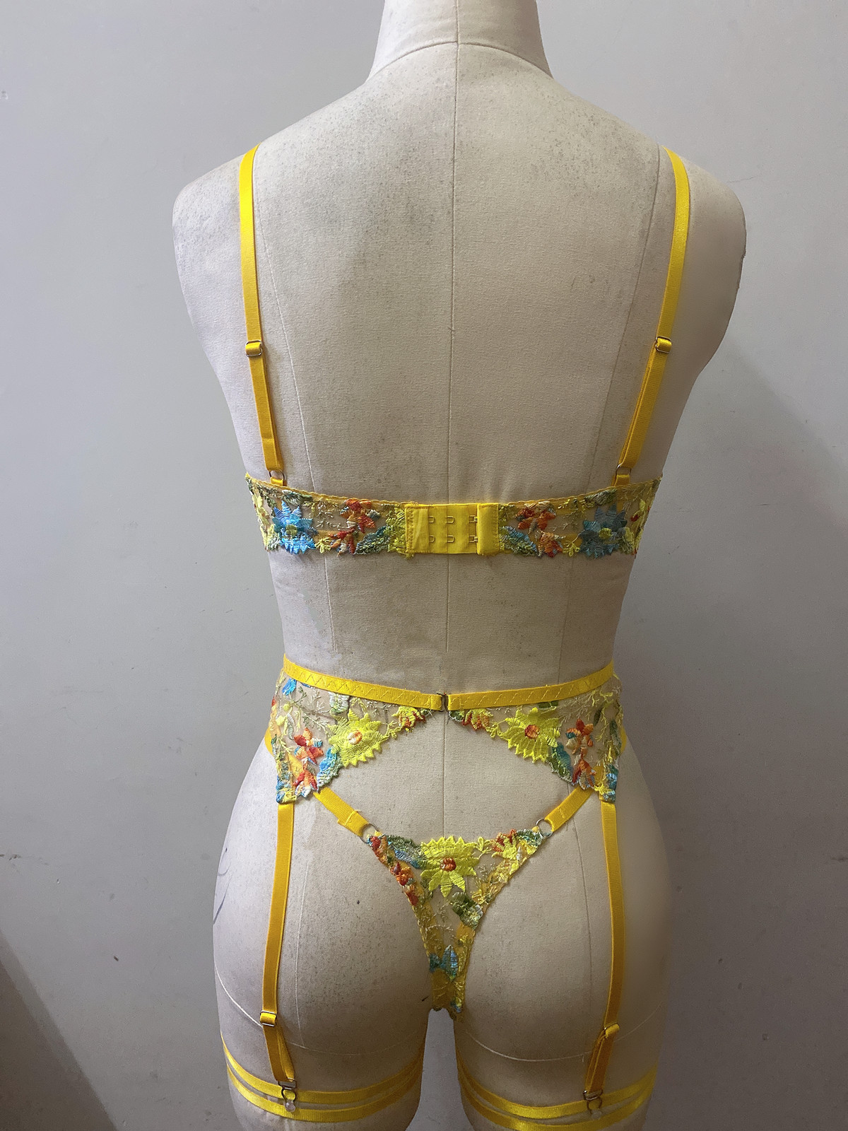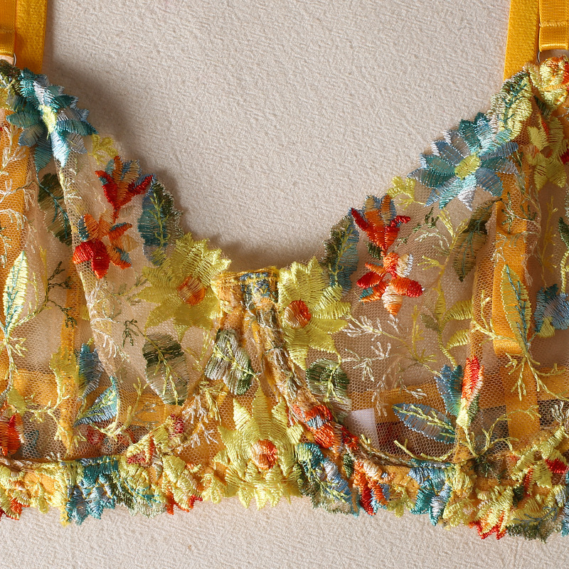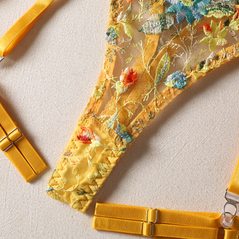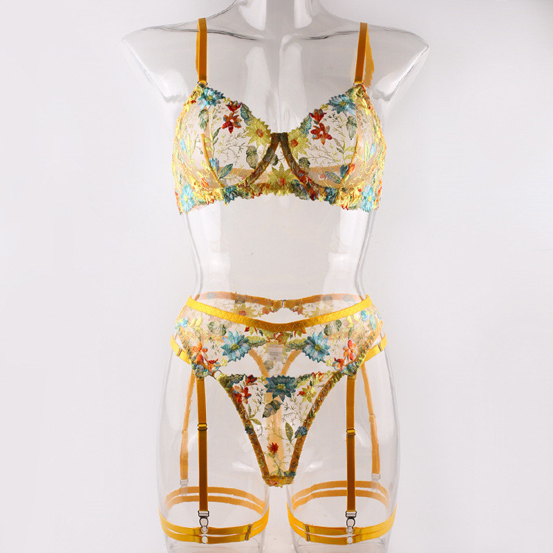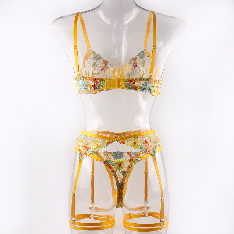 FREEDOMEBEAUTY | European and American sexy perspective yellow flower embroidered bra garter thong with leg ring three-piece underwear set